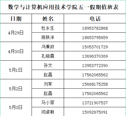 五一假期值班表