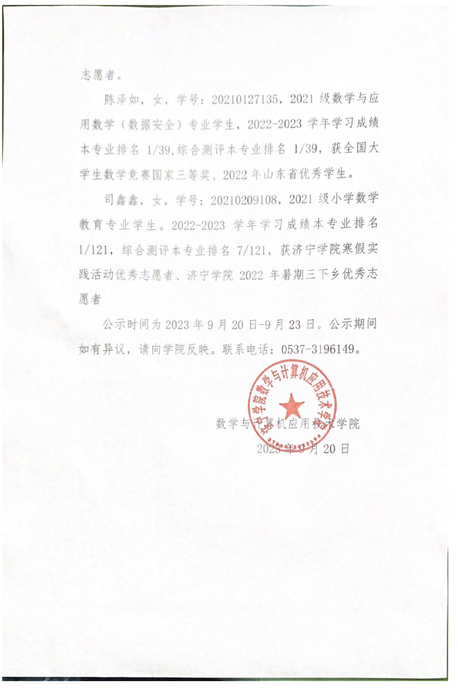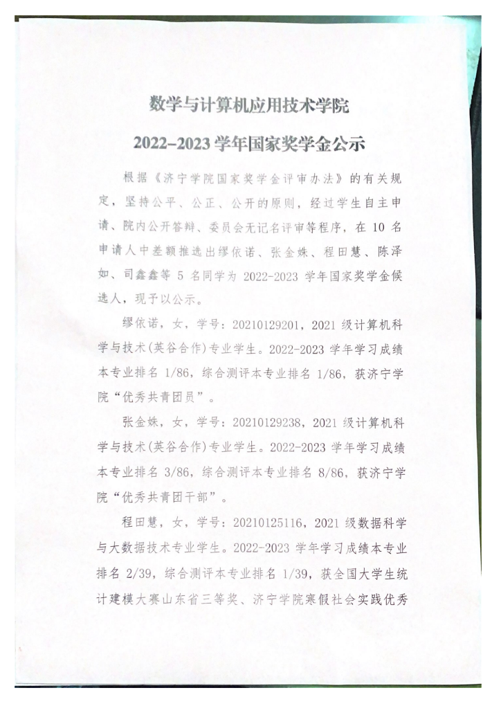 2023年9月20日,10名国家奖学金申请人进行学院内公开答辩。根据答辩情况,由学院奖学金评审委员会进行无记名评审,后经学院党政联席会讨论通过,差额推选出缪依诺、张金姝、程田慧、陈泽如、司鑫鑫共5名同学为2022-2023学年国家奖学金候选人。9月20日-23日,将2022-2023学年的国家奖学金候选人情况在学院内公示三天,无任何异议。9月26日,将最终结果上报校资助管理中心。