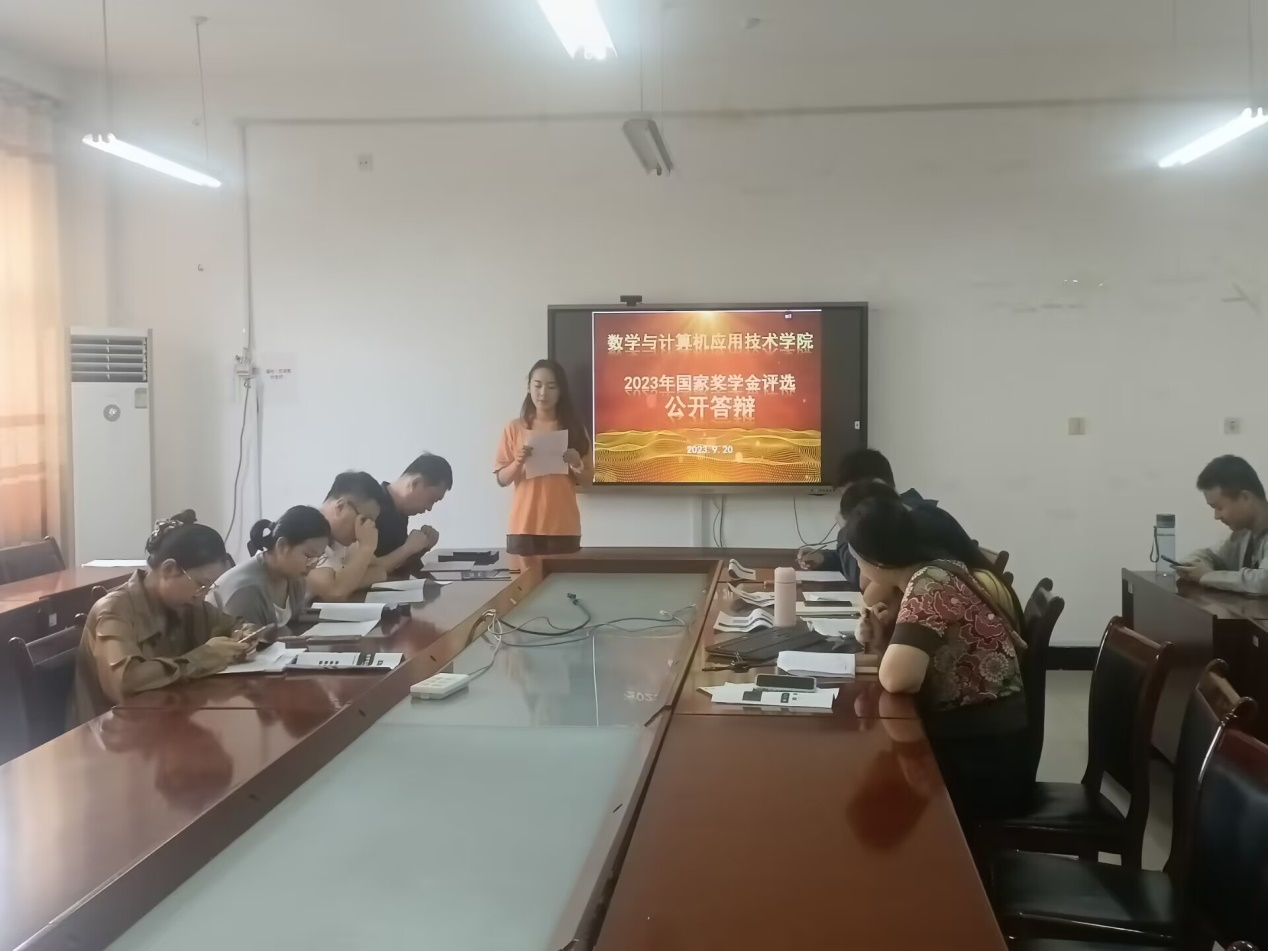 学院于2023年9月15日,成立了由学院党委书记孙文、院长刘军为主任,党委副书记冯秉政、副院长杜永生、副院长马小翠为副主任,辅导员及部分学生代表为成员的奖学金评审委员会。9月16日,在评审委员会指导下,发布《数学与计算机应用技术学院关于申请2023年国家奖学金的通知》,组织学生进行报名。9月16-19日,由学生本人提出申请,各辅导员根据评审条件,进行申请人初步筛选,最终推选出陈泽如、程田慧、杜蕾、贺程矗、靳步、缪依诺、司鑫鑫、王淳、张金姝、张入凡等10名学生参与国家奖学金学院公开答辩。