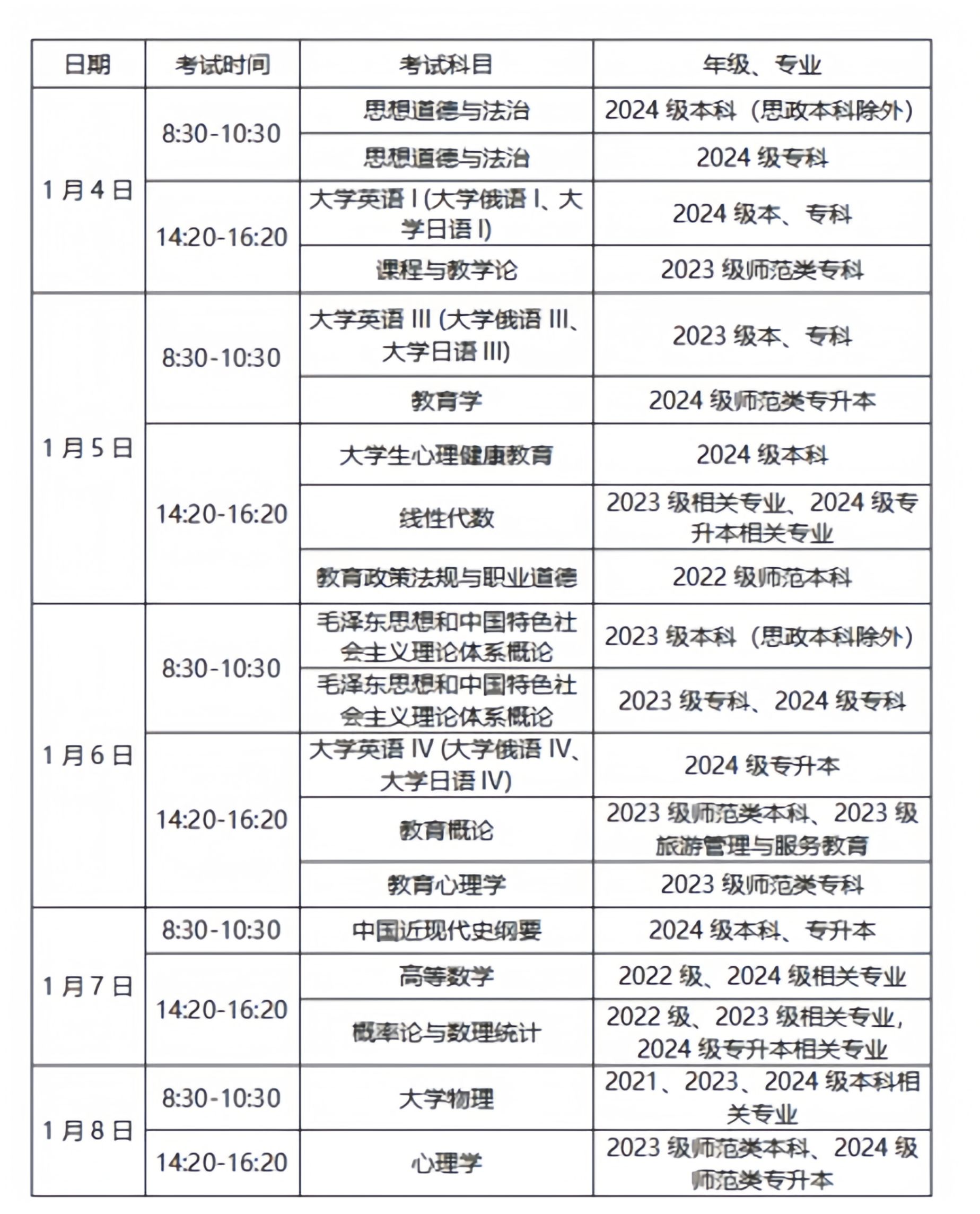 1.通识课程、教师教育课程、大学生心理健康教育、大学物理、数学类课程考试时间集中安排在1月4日至1月8日,由学校统一编排,学生所在学院组织考试。