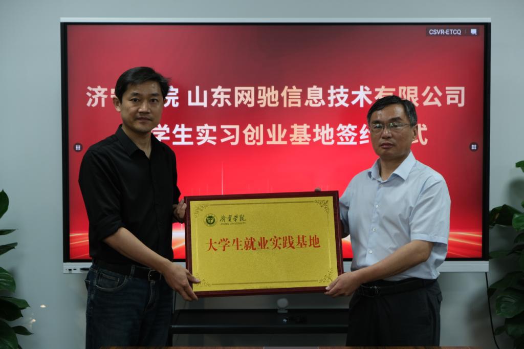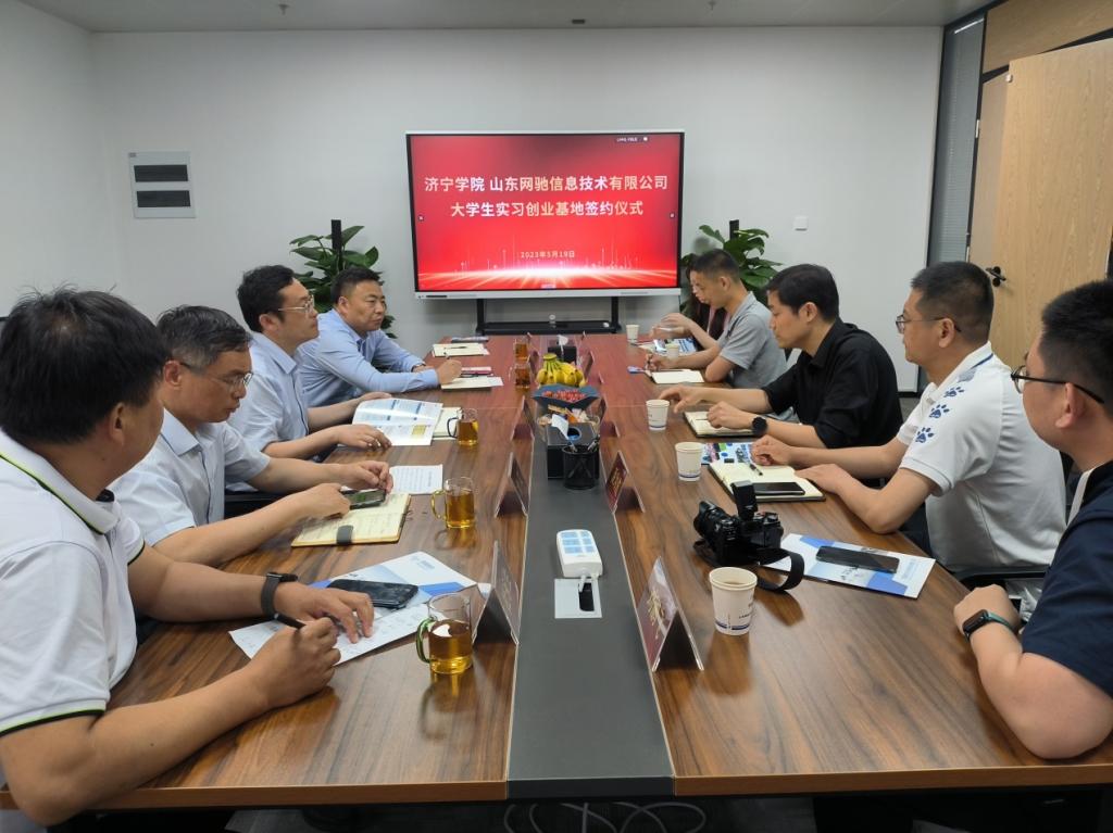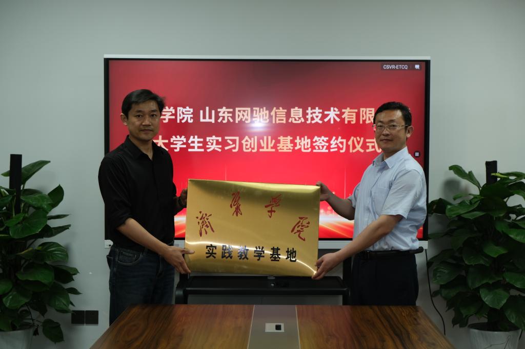 在山东网驰信息技术公司,总经理孟祥东对刘克非一行的到来表示热烈欢迎,他介绍了公司的发展概况、主营业务板块以及岗位人才需求等情况,表示将进一步推动校企联动全方位育人,加强供需对接,助力学生高质量就业和人才培养高质量发展。刘克非向企业方介绍了学校“四校区一基地”的办学格局以及学科建设、人才培养、重点工作等方面的情况,期待与公司在“双师型”培训基地建设、学生就业基地建设、共建产业学院等方面开展合作。会后,刘克非与孟祥东共同签订了实践教学基地合作协议并授牌。孙文与孟祥东共同签订了就业实践基地合作协议并授牌。