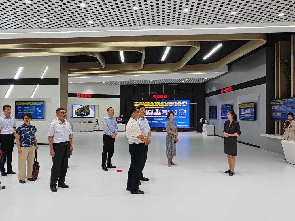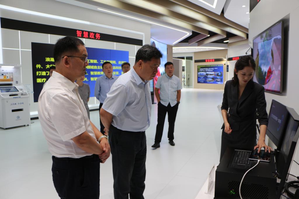 王清明在浪潮软件赵绍祥陪同下参观了浪潮集团展厅,详细了解了浪潮集团的发展历程,以及在云计算、大数据、信创产业、智慧教育等方面的技术和场景案例。