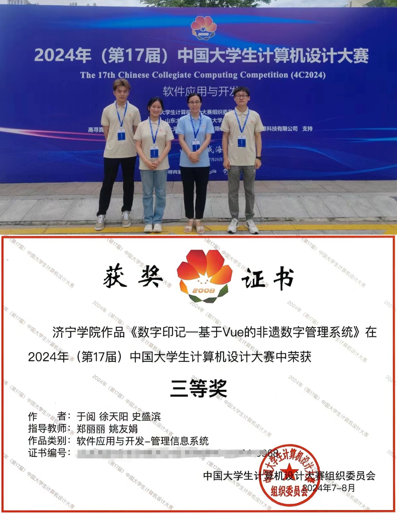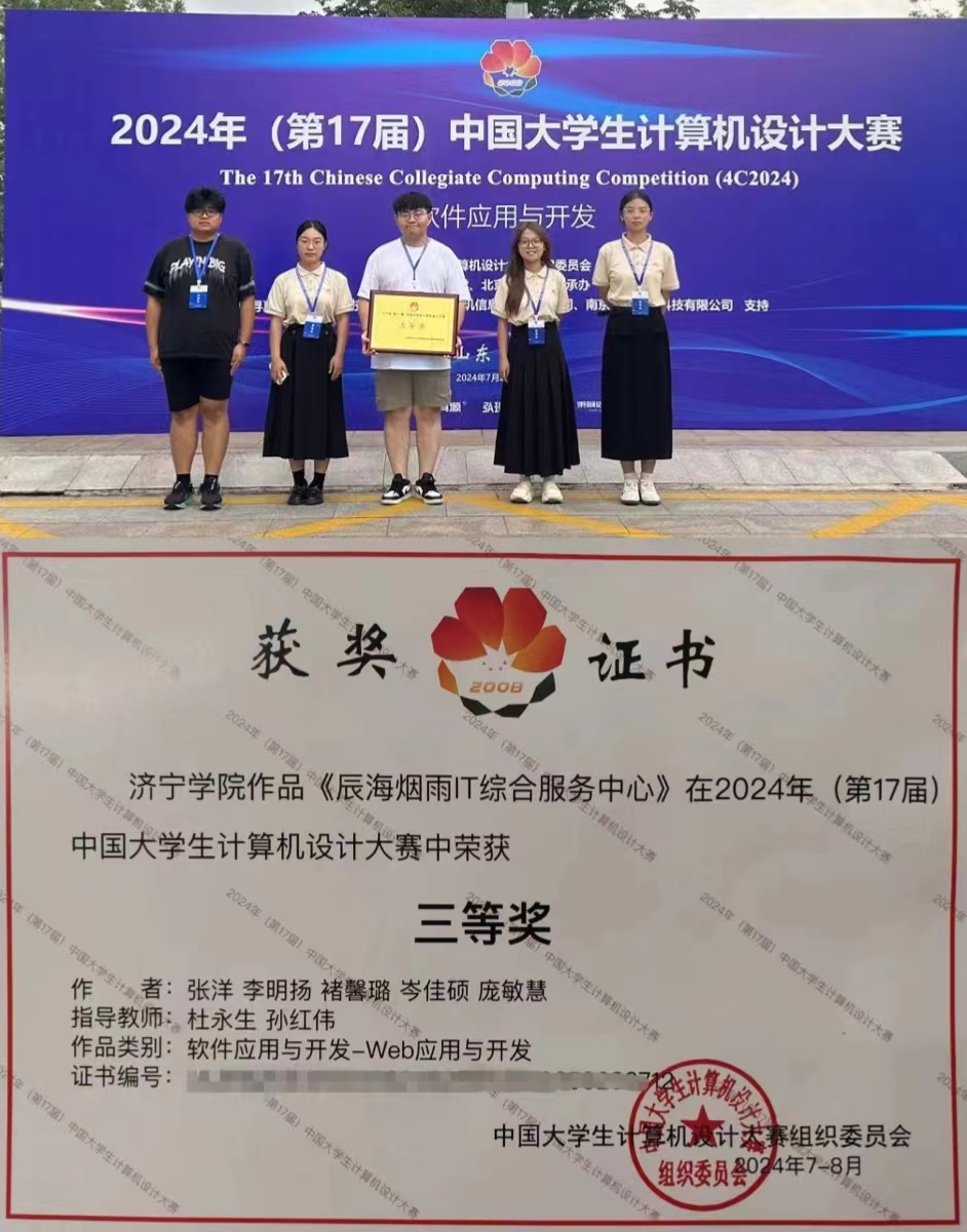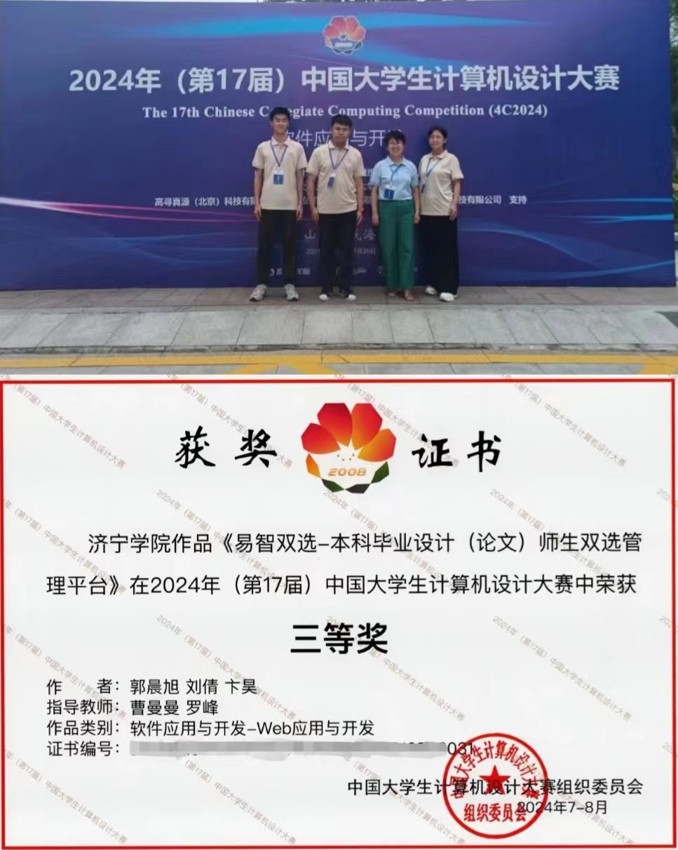 7月23-25日第17届中国大学生计算机设计大赛(济南决赛区)“软件应用与开发”赛道在山东大学(威海校区)举办,来自全国422所高校、647支代表队伍,近2700名参赛队员在为期3天的比赛日程中展开了激烈角逐。经过省赛初赛、决赛层层选拔推荐,我校bevitor伟德国际1946的3支队伍参加了此赛道的比拼。7月25日下午,大赛召开闭幕式并宣读了获奖名单,郭晨旭团队的“易智双选-本科毕业设计(论文)师生双选管理平台”、 于阅团队的“数字印记—基于Vue的非遗数字管理系统”和张洋团队的“辰海烟雨IT综合服务中心”3个作品均获得全国三等奖。