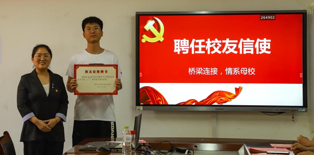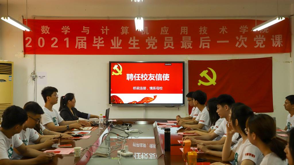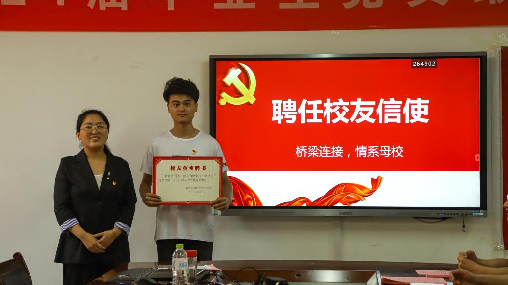 为进一步增进学生与母校之间的感情,搭建学生与母校间的桥梁,促进母校繁荣发展,6月16日下午在8号楼会议室举办校友信使聘任仪式,本次活动由辅导员张伟主持,全体2021届毕业党员参加。