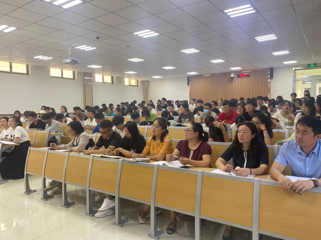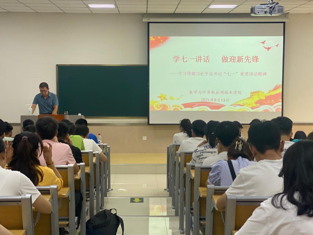 2021年9月13日下午2:30,数学与计算机应用技术学院党委书记许杰在8号楼B203教室以《学七一讲话 做迎新先锋》为题作学习贯彻习近平总书记“七一”重要讲话精神的报告。党委副书记张静、团委书记冯秉政、全体辅导员,以及学生会主要干部、班长团支书参加此次学习。