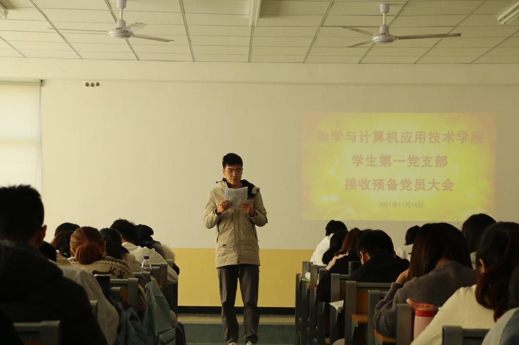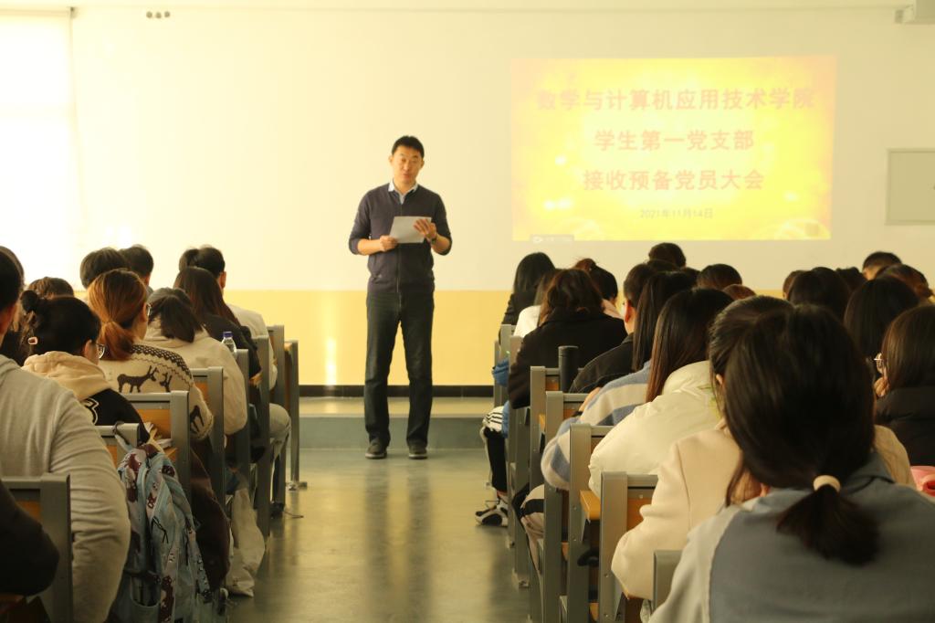 2021年11月14日,数学与计算机应用技术学院学生第一党支部在8号楼A201举行接收预备党员大会,会议由党支部书记冯秉政主持,学院党委书记许杰、副书记张静、副院长杜永生、组织员申莹列席本次会议。