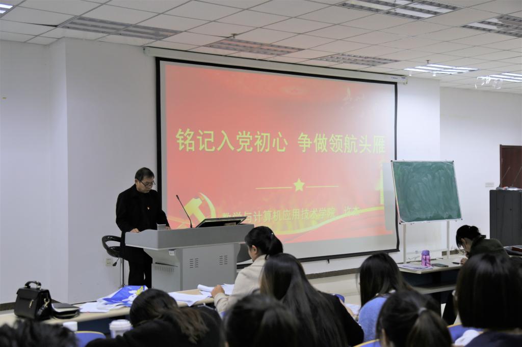 2021年11月18日,数学与计算机应用技术学院党委书记许杰,在应用型人才培养基地A3108教室,为学生第三支部全体党员讲授题为《铭记入党初心 争做领航头雁》的党课。党委副书记张静、学生党支部书记郑伟、组织委员张颖以及支部全体党员参加。