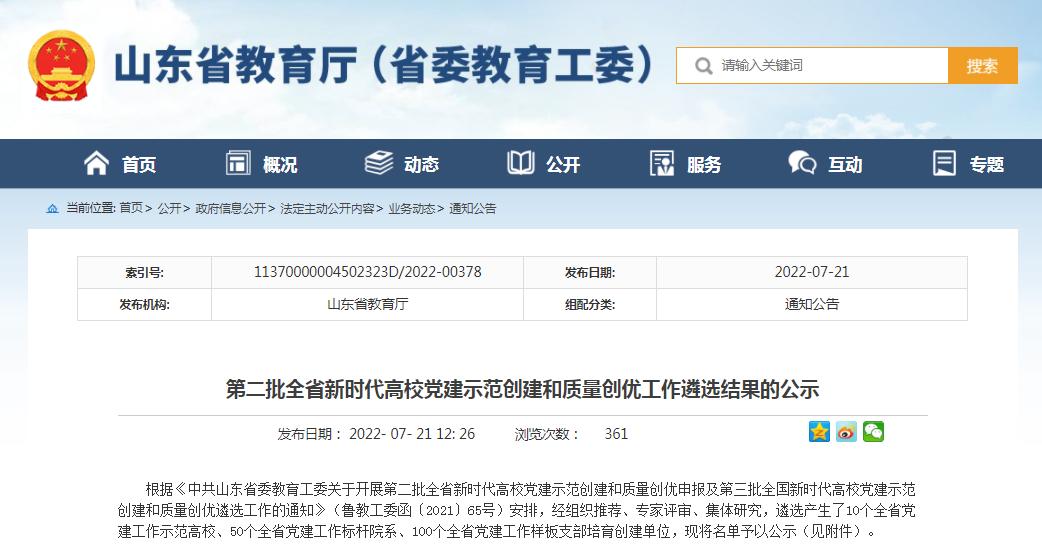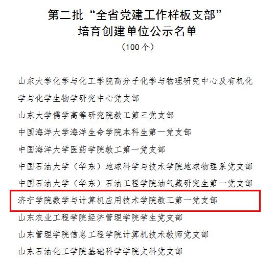 近日,中共山东省委教育工委公布了“第二批全省高校党建‘双创’工作”遴选结果,数学与计算机应用技术学院教工第一党支部入选第二批全省党建工作样板支部培育创建单位。