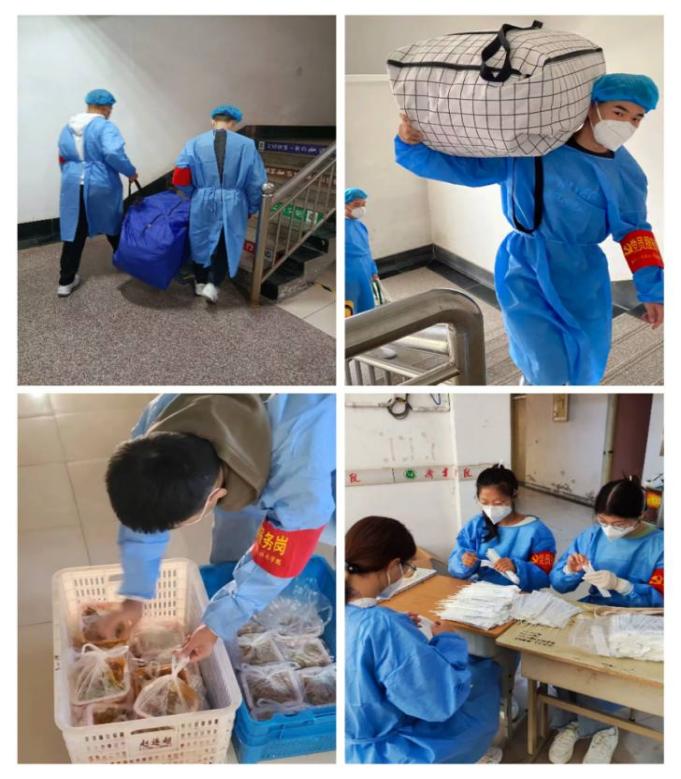 面对突如其来的疫情,广大党员们冲锋在前,积极响应号召,在静默的5号楼中担任志愿者,为隔离的同学们送水送饭,充分发挥出了党员的先锋模范作用。