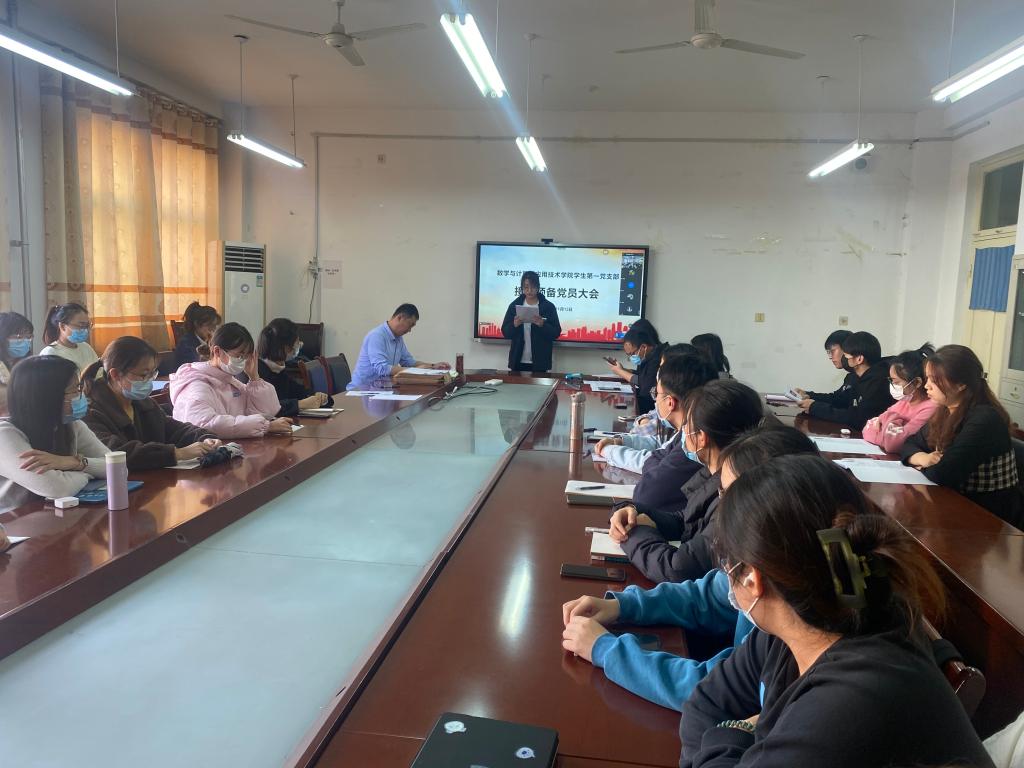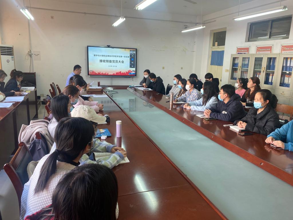 2022年11月11日下午,数学与计算机应用技术学院学生第一党支部在8号楼213会议室召开接收预备党员大会。支部全体成员通过线上线下结合的方式参加。会议由支部书记冯秉政主持,党委委员、副院长杜永生,以及学院专职组织员申莹列席。