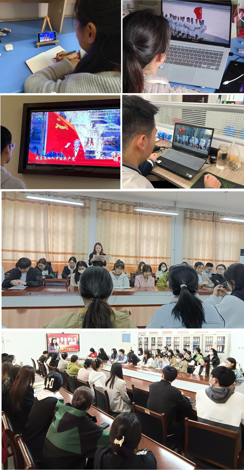 经过前期宣传号召,支部党员以分散学习的方式观看直播,他们或在宿舍、或在家里、或在图书馆、教室,利用手机、电视、电脑等进行观看,并上交截图。