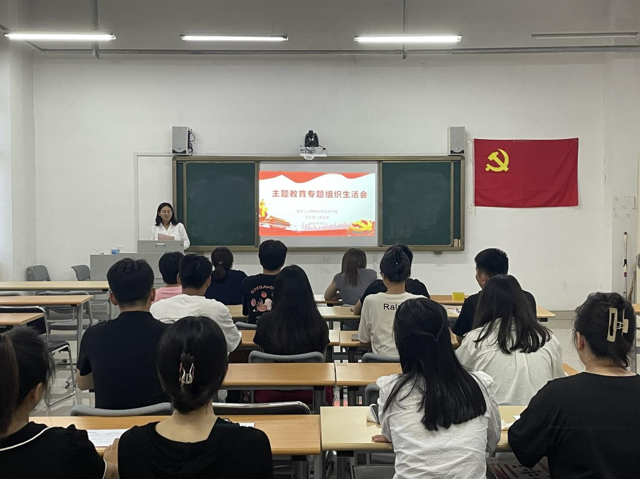 为进一步聚焦学习贯彻习近平新时代中国特色社会主义思想主题,重点学习领悟“以学铸魂、以学增智、以学正风、以学促干”的丰富内涵,9月7日下午,数学与计算机应用技术学院学生第三党支部于应用型人才培养基地B2505教室顺利召开2023年度主题教育专题组织生活会。会议由学生第三党支部书记王蒙蒙主持,辅导员张亚敏、卓硕硕及全体党员参加。