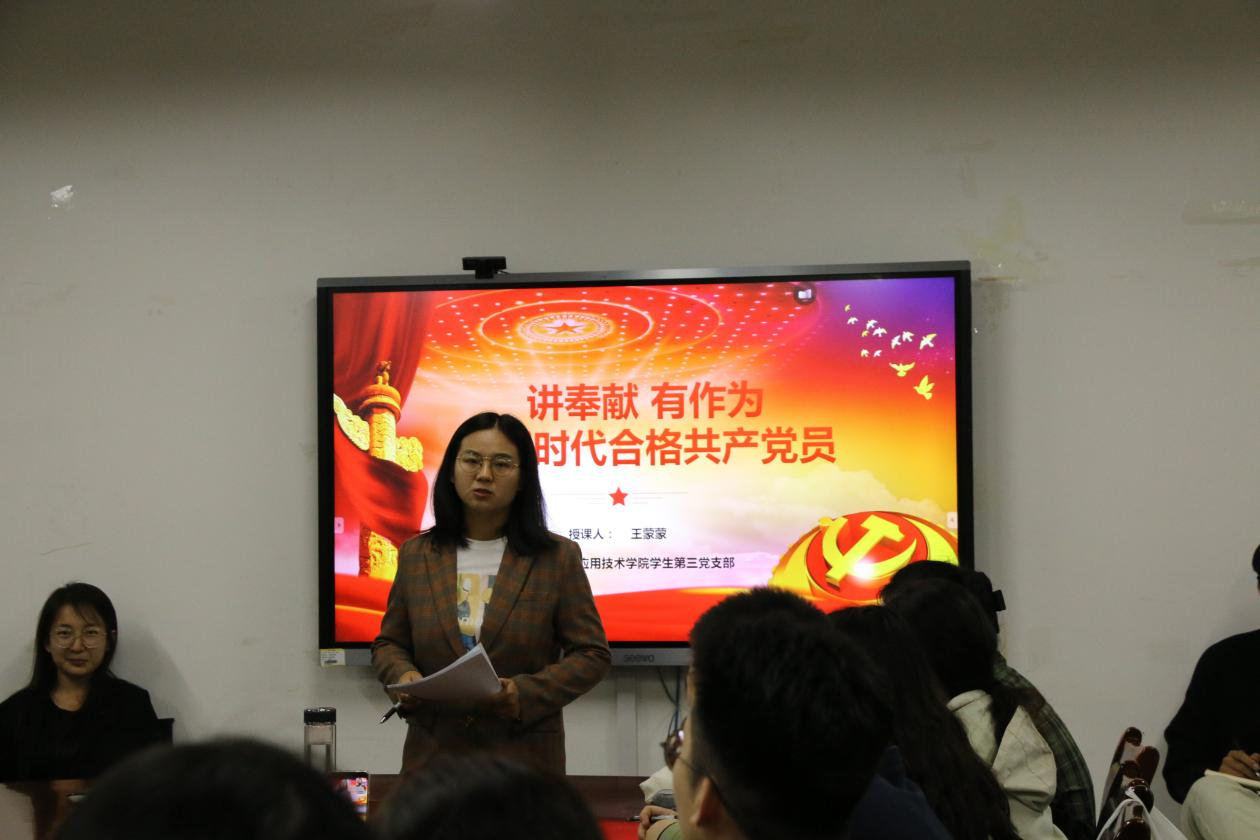 10月28日上午,学生第三党支部书记王蒙蒙在8A213会议室召开“讲奉献、有作为——争做新时代合格共产党员”主题党课,围绕奉献责任当担是共产党员的基本素质、新时代对党员的四点新要求、在实践中落实共产党员的责任担当做合格党员等方面内容展开讲授。