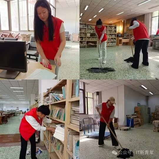 活动中,志愿者们积极地开展图书馆清理工作,包括环境卫生整治、书籍整理、设施设备检修等,对图书馆内公共区域、阅览室、书库等进行全面清扫,消除卫生死角,营销良好的阅读环境;整理归还书籍,热情地帮助老师搬放捐赠的书籍,听从图书馆工作人员安排将其按编号正确摆放,方便读者查找;把图书馆办公室内陈旧设备统一放置。在志愿服务期间,为了保持阅览室安静的学习环境,他们在书架间轻步穿梭,做到轻拿轻放,不影响同学们看书。