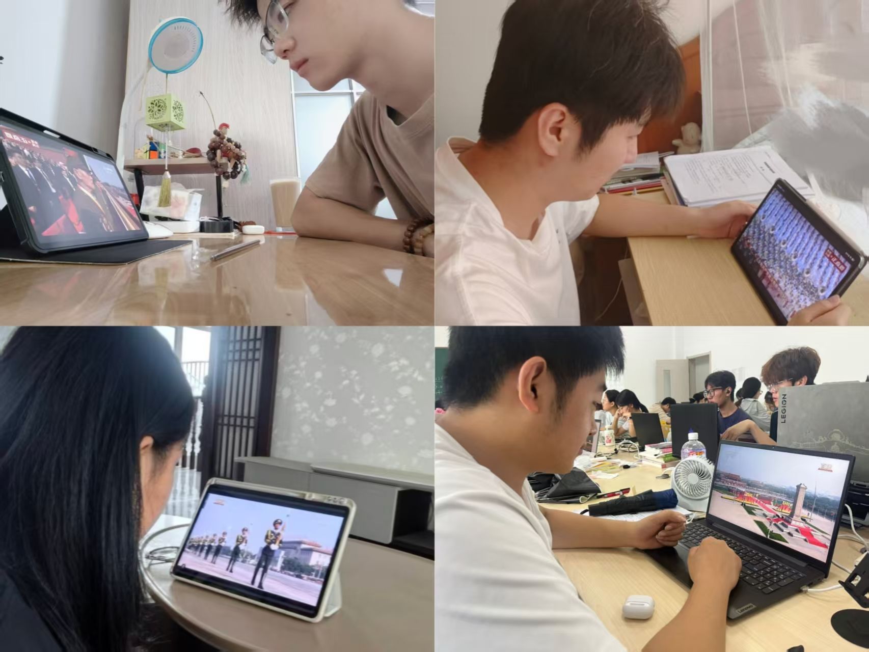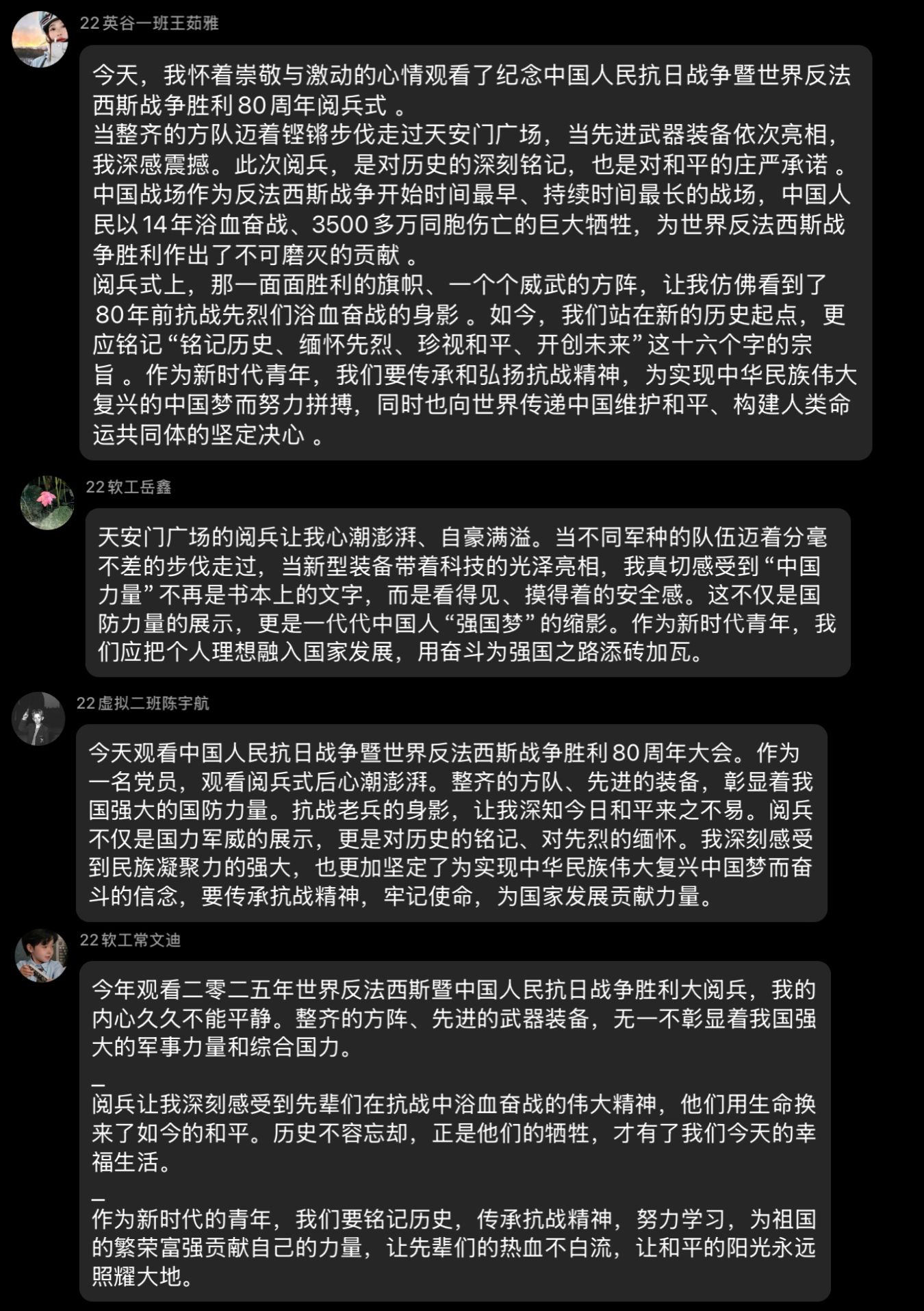 直播画面中,徒步方队迈着铿锵步伐踏过长安街,装备方队载着国之重器缓缓驶过,空中梯队拖着彩烟划破长空。每一个震撼瞬间,都让线上的师生心潮澎湃。那整齐划一的队列、先进精良的装备,展示了我国强大的国防力量和军队现代化建设的卓越成就,也让大家感受到了中华民族的伟大复兴和中国维护世界和平的坚定决心。结束后,党支部成员们通过线上交流讨论,一致认为,此次阅兵是一次振奋精神的盛典,是人民军队奋进建军百年的崭新亮相,不仅展示了我国强大的国防实力,更彰显了中华民族的凝聚力和向心力,是伟大抗战精神和伟大民族精神在新时代赓续传承的重要体现。同时,学生党员应铭记历史,缅怀先烈,珍爱和平,开创未来,以实际行动践行初心使命,为学院的发展和国家的繁荣贡献力量。