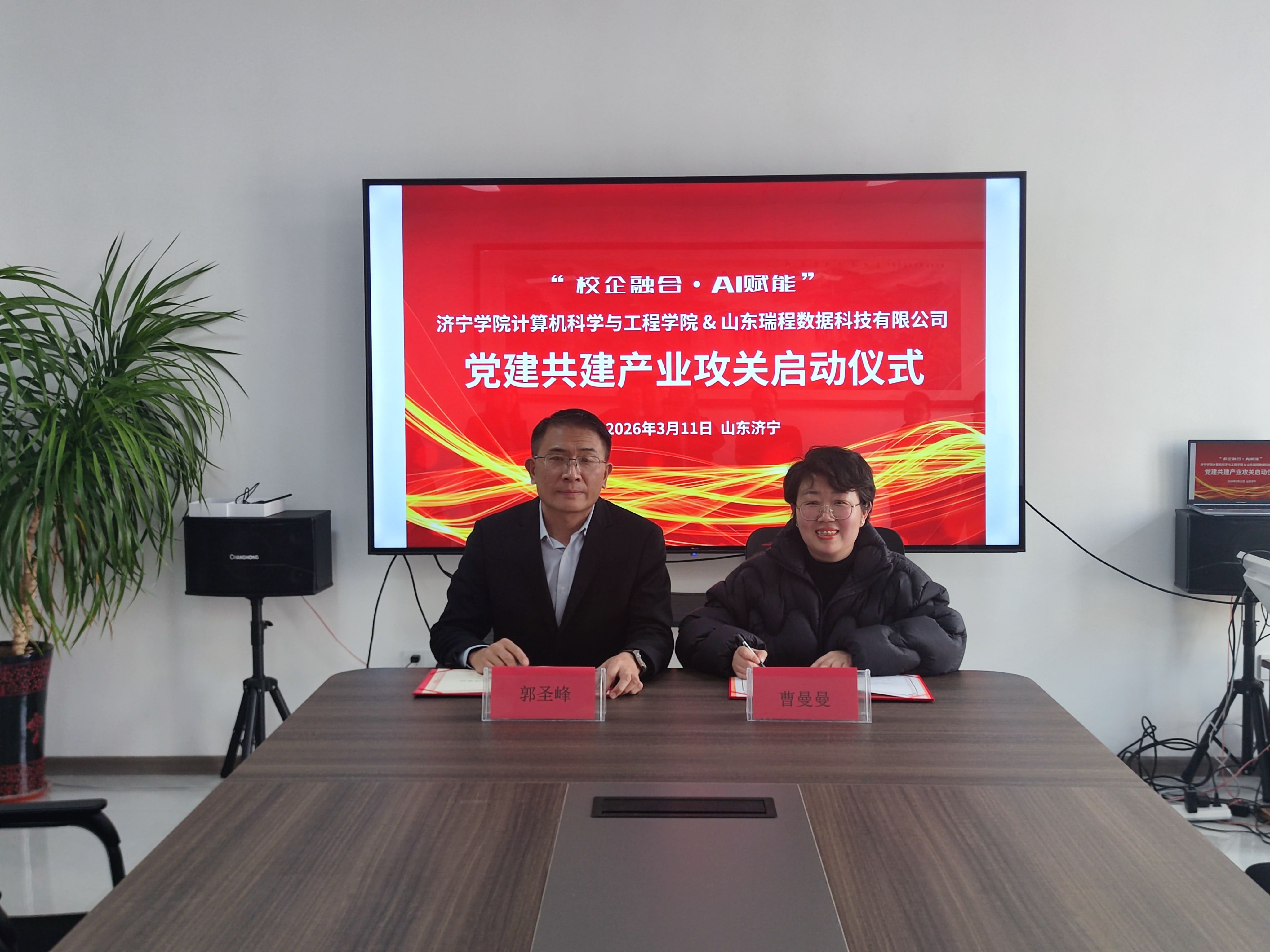 随后,双方隆重举行“校企融合·AI赋能”党建共建产业攻关启动仪式。学院教工党支部书记曹曼曼与山东瑞程数据科技有限公司总经理郭圣峰签署党建共建协议。此次签约标志着校企双方将以党建为引领,在人工智能、大数据等领域开展更深层次合作,实现资源共享、优势互补。