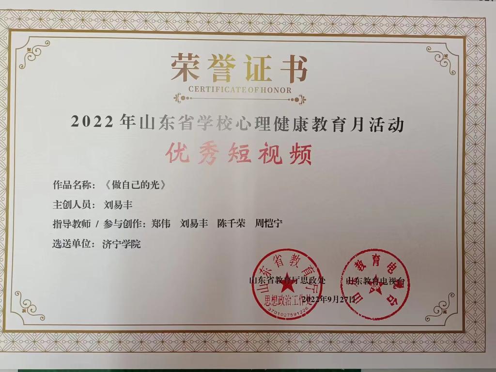 庆祝我院刘易丰等同学在2022年山东省学校心理健康教育月“心中有梦,眼里有光”心理健康主题微视频比赛活动中荣获“优秀短视频奖”