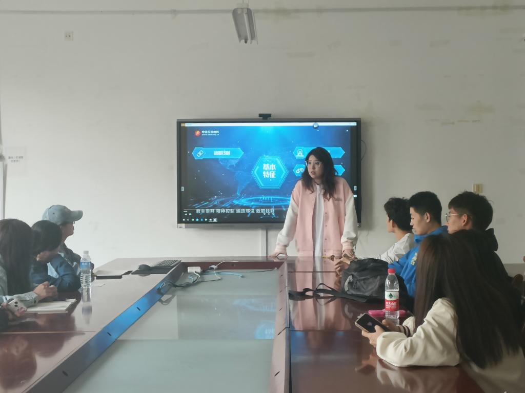 与会成员一同观看学习中国反邪教网中“反邪教警示教育进校园”专题的教育影片。教育影片通过讲述一一个个真实的案例,以邪教参与者惨痛的教训和血淋淋的事实揭示了邪教对家庭、社会、人身造成的危害,以及邪教反人类、反社会的本质,讲解如何辨别邪教、抵制邪教侵害。观看结束后,与会成员就自己对邪教的认识、如何辨别和抵制邪教侵害展开交流。辅导员王都谈到,作为青年大学生,一定要清晰、明确地认识到邪教对人们的身心健康的侵害、对社会治安稳定的扰乱和破坏,以身作则、旗帜鲜明地反对邪教组织的侵害。辅导员陈轶洋谈到,身为学生班团骨干,更应该提高认识,认识到邪教的本质和邪教组织的危害性,以身作则开展反对邪教的宣传教育,起到榜样作用。
