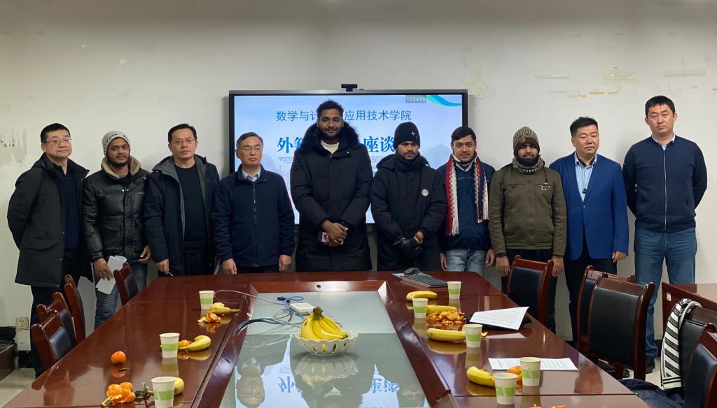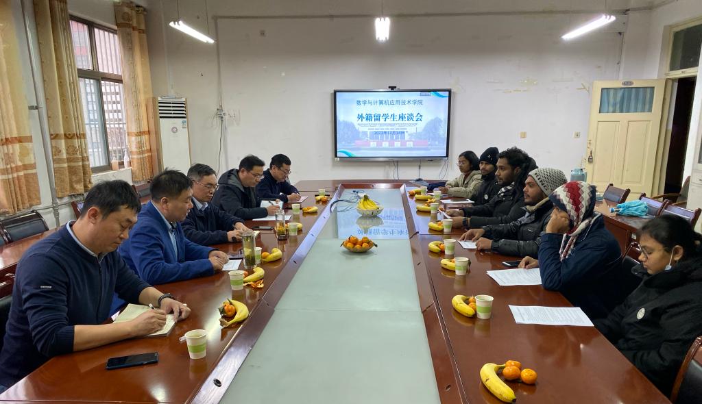 12月14日下午,数学与计算机应用技术学院在8号楼213会议室召开2023级外籍留学生座谈会。国际教育学院院长李刚、学院党委书记孙文、国际教育学院综合科科长张振、学院副院长杜永生、学院党委副书记冯秉政出席。2023级计算机科学与技术专业7名孟加拉国留学生参加。座谈会由副院长杜永生主持。