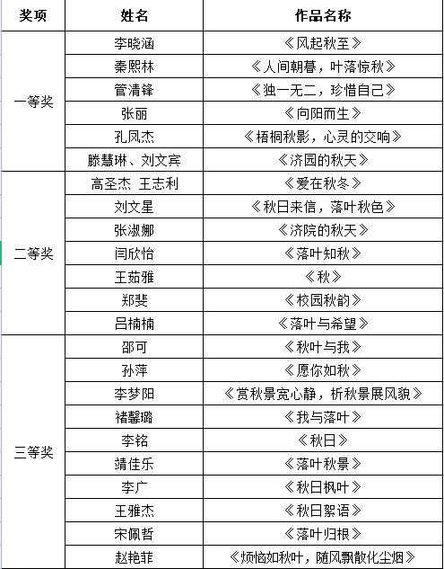 活动分为“落叶作品”和“秋日摄影”两部分。同学们以落叶为主要元素,在纸上进行创作,留下秋天的影子,与自然接触,用花木表达内心的情感,以画话心,与美好不期而通。通过摄影,每一张鲜活的照片下,用镜头展现和谐校园的魅力,将他们对于人世间的柔美慢慢诉说。活动吸引一百余人参加比赛,经过评选,“落叶作品”评选出一等奖三人、二等奖7人、三等奖8人。“秋日摄影”评选出一等奖8人、二等奖8人、三等奖10人。