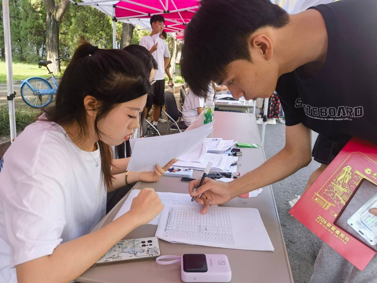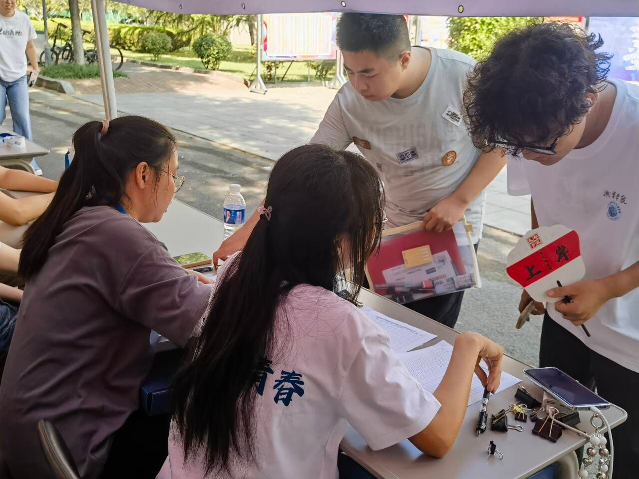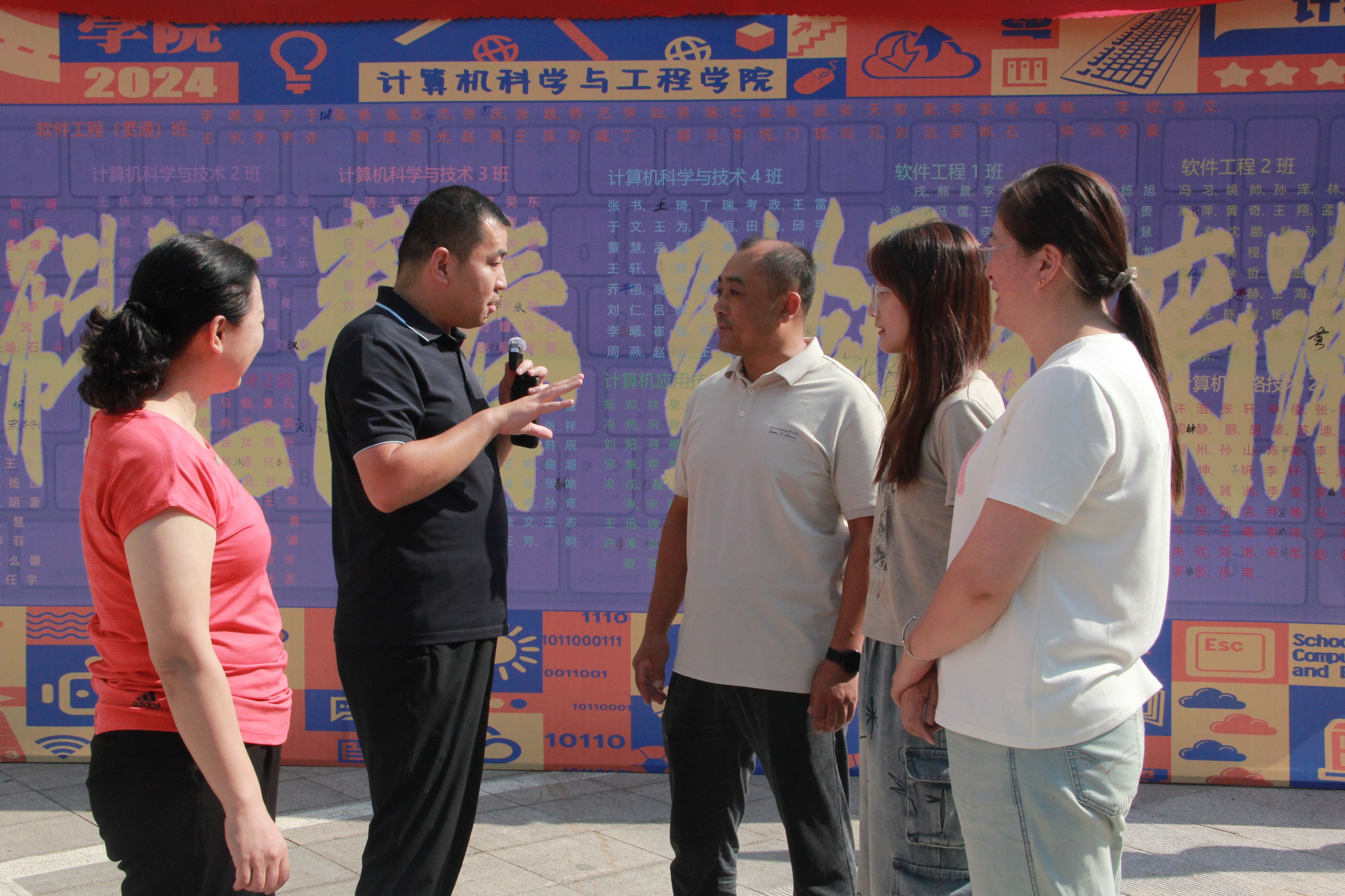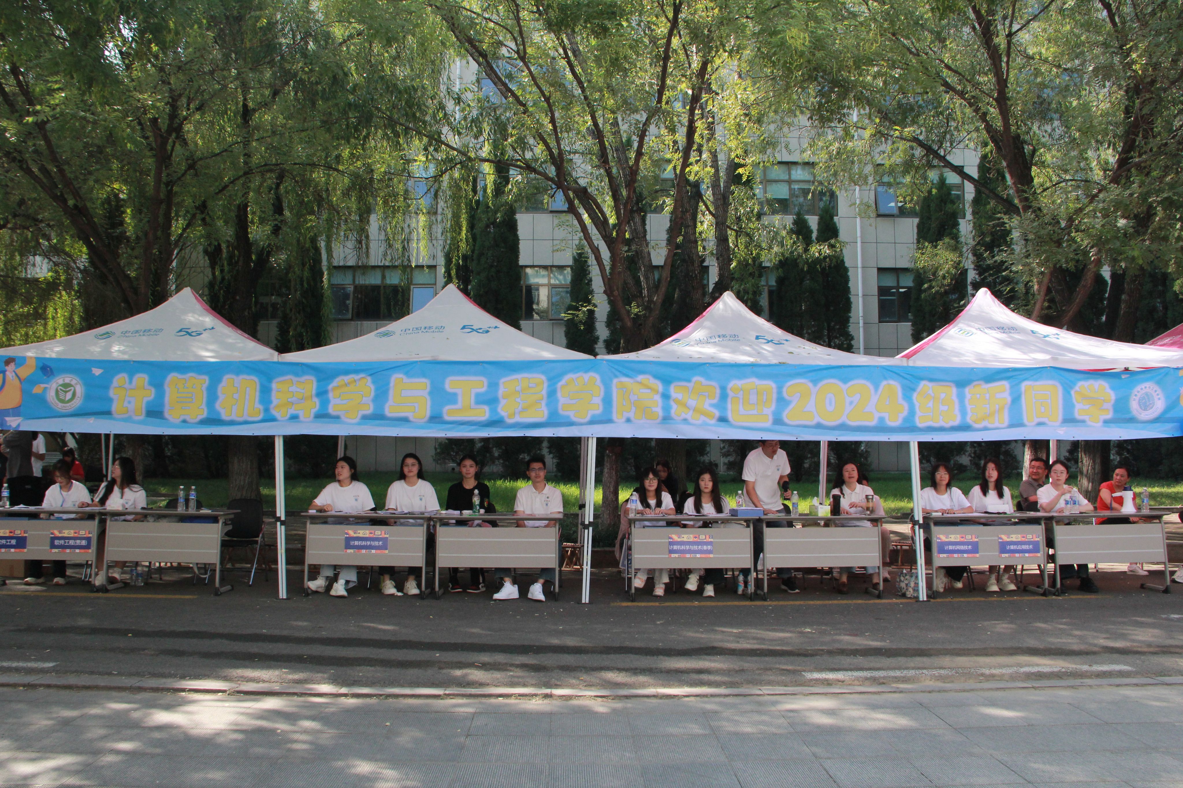 迎着朝阳,伴着晨曦。计科学院的志愿者们早已整装待发,在各自的岗位上热情迎接,指引答疑,为新生和家长提供细致周到的服务。