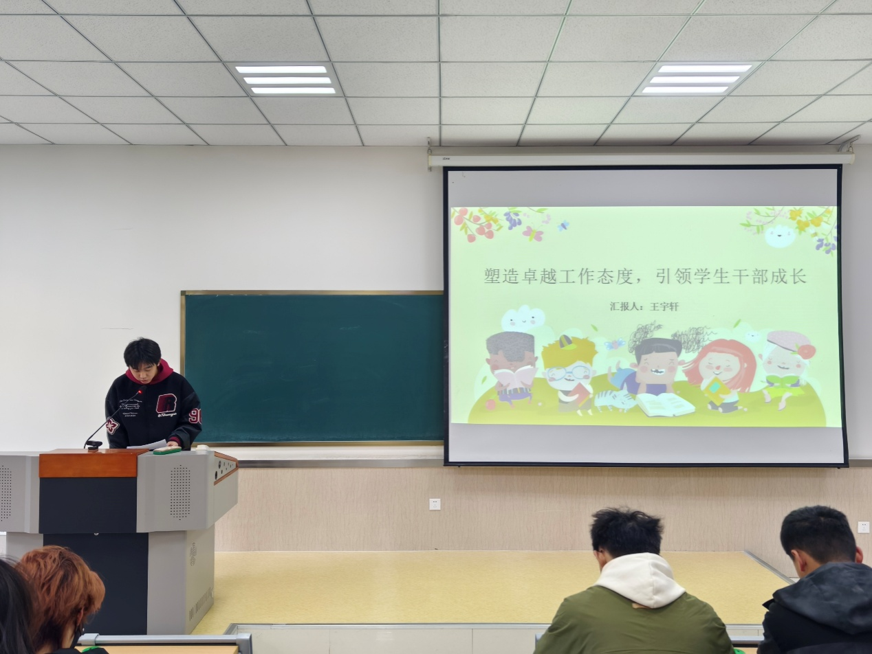 学习实践部部长王宇轩通过对自身经历以及在任职过程中所产生的问题的叙述,向大家分享所积累的工作经验,以便大家汲取经验,在后续的部门工作中更为灵活地应对各项问题,最后,他强调学生干部应具备认真,责任,努力的态度,三者相辅相成,缺一不可。