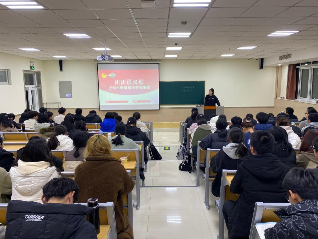 为落实“青鸟计划·技能提升季”工作要求,充分调动师生参加大学生创新创业赛事的积极性和热情,加强双创教育宣传和落地,11月29、30日,数学与计算机应用技术学院“团团说双创”活动分别在3号楼C201、8号楼B101教室开讲。学院团委副书记陈轶洋以“大学生创新创业赛事解读”为主题,为2023级全体数学方向学子授课。
