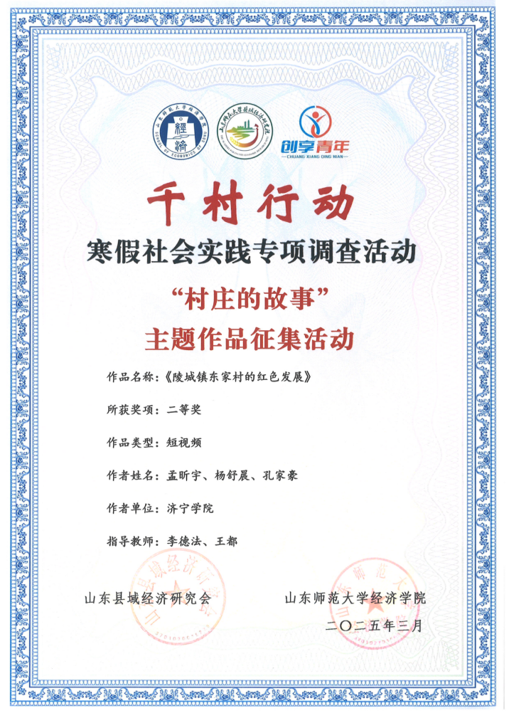 近日,由山东县域经济研究会与山东师范大学经济学院联合举办的“千村行动”寒假社会实践专项调查活动圆满落幕。本次活动共吸引近2000支调研队伍,3000余名师生参与活动,经专家评审,最终评选出331个“村庄的故事”主题作品征集活动优秀作品、212个要素赋能乡村发展专项数据调研优秀成果。bevitor伟德国际1946师生积极参与,精心完成了高质量调研报告,在“村庄的故事”主题作品专项活动中荣获二等奖1项。