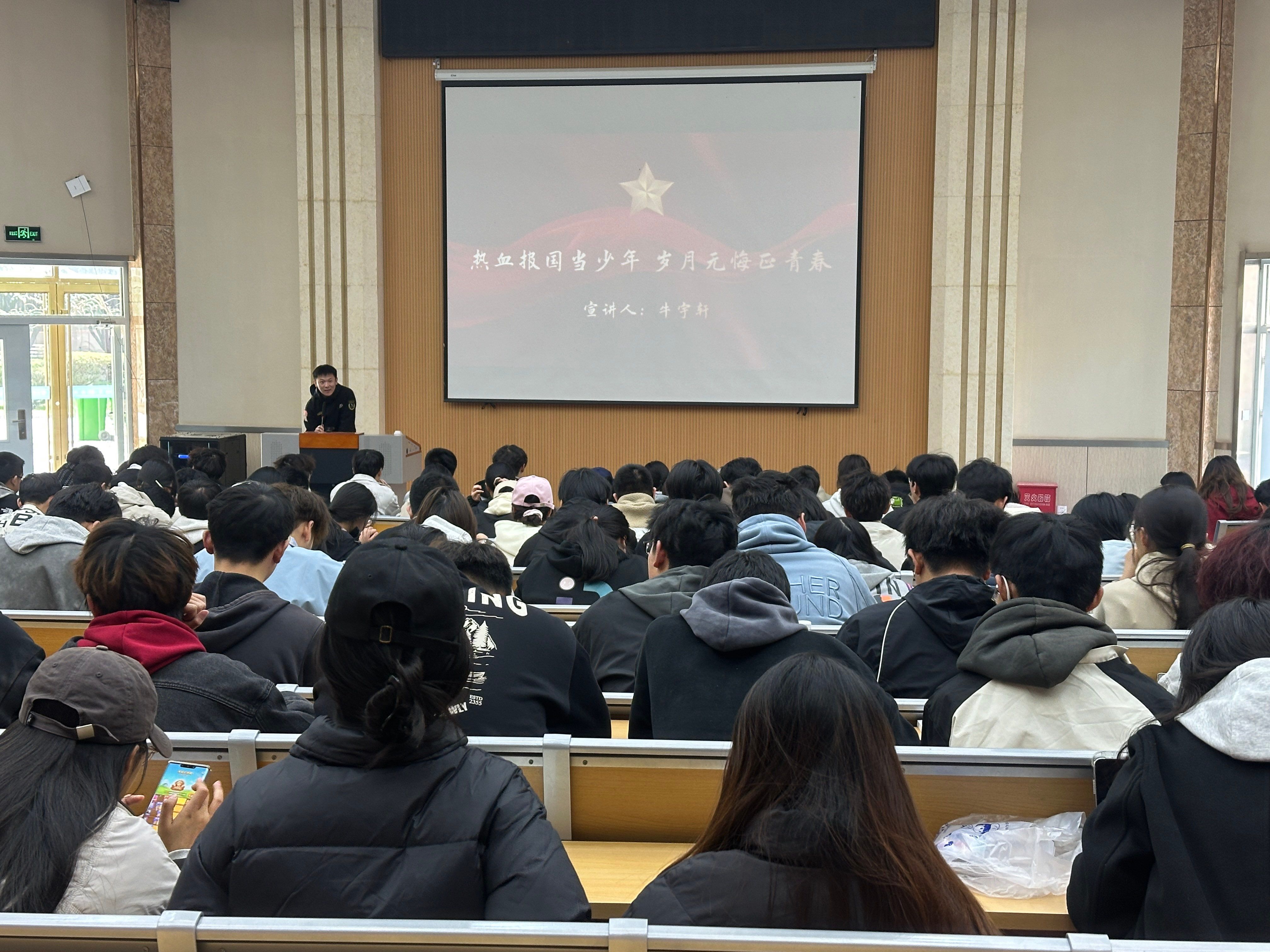 活动伊始,牛宇轩凭借深厚军事知识储备,用简洁易懂的语言,深入浅出地讲解我国四大战区的战略定位与关键职能,让同学们清晰了解国防体系空间布局,深化对国防架构的认知。接着,他结合军队改革趋势,阐释军衔等级划分,帮同学们理解军队组织管理体系。随后,他声情并茂地讲述戍边英雄祁发宝、“兵王”刘近的故事,展现军人的使命与担当,引发强烈共鸣,现场掌声不断。最后,牛宇轩呼吁同学们积极参军,把个人理想融入强军事业,在军营实现人生价值,为民族复兴出力。同学们深受鼓舞,踊跃表达投身军营、报效祖国的决心。
