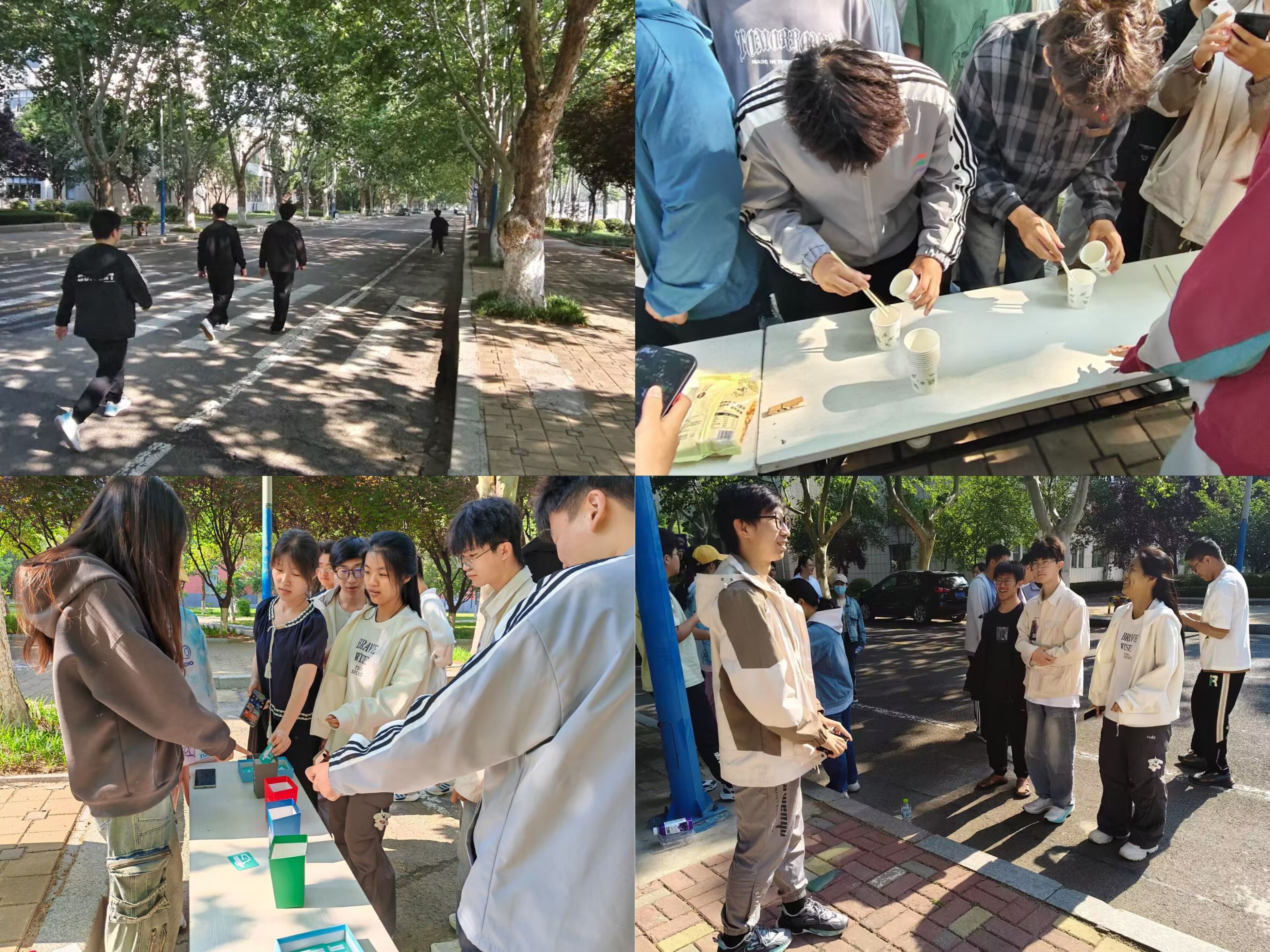 活动当日,校园内繁花盛开、碧空如洗。同学们精神抖擞、步伐矫健,充分展现出计科学子昂扬向上的精神风貌。为丰富活动内容,提升趣味性,活动路线沿途精心设置了四个特色趣味游戏环节。在“粮食归仓”游戏中,4名学生需配合使用筷子夹取豆子,现场氛围紧张而热烈;“职业模仿秀”环节,参与者抽取职业卡片进行情景模拟,生动再现工人砌墙、厨师颠锅等职业场景,引得队友竞相抢答;“清洁大作战”以垃圾卡片投放的方式,检验学生对环保知识的掌握程度;“劳动知识问答”围绕劳动节起源等内容展开,学生们积极踊跃作答。通过参与这些富有趣味性与知识性的游戏,学生们在轻松愉快的氛围中完成了环校健步走活动。