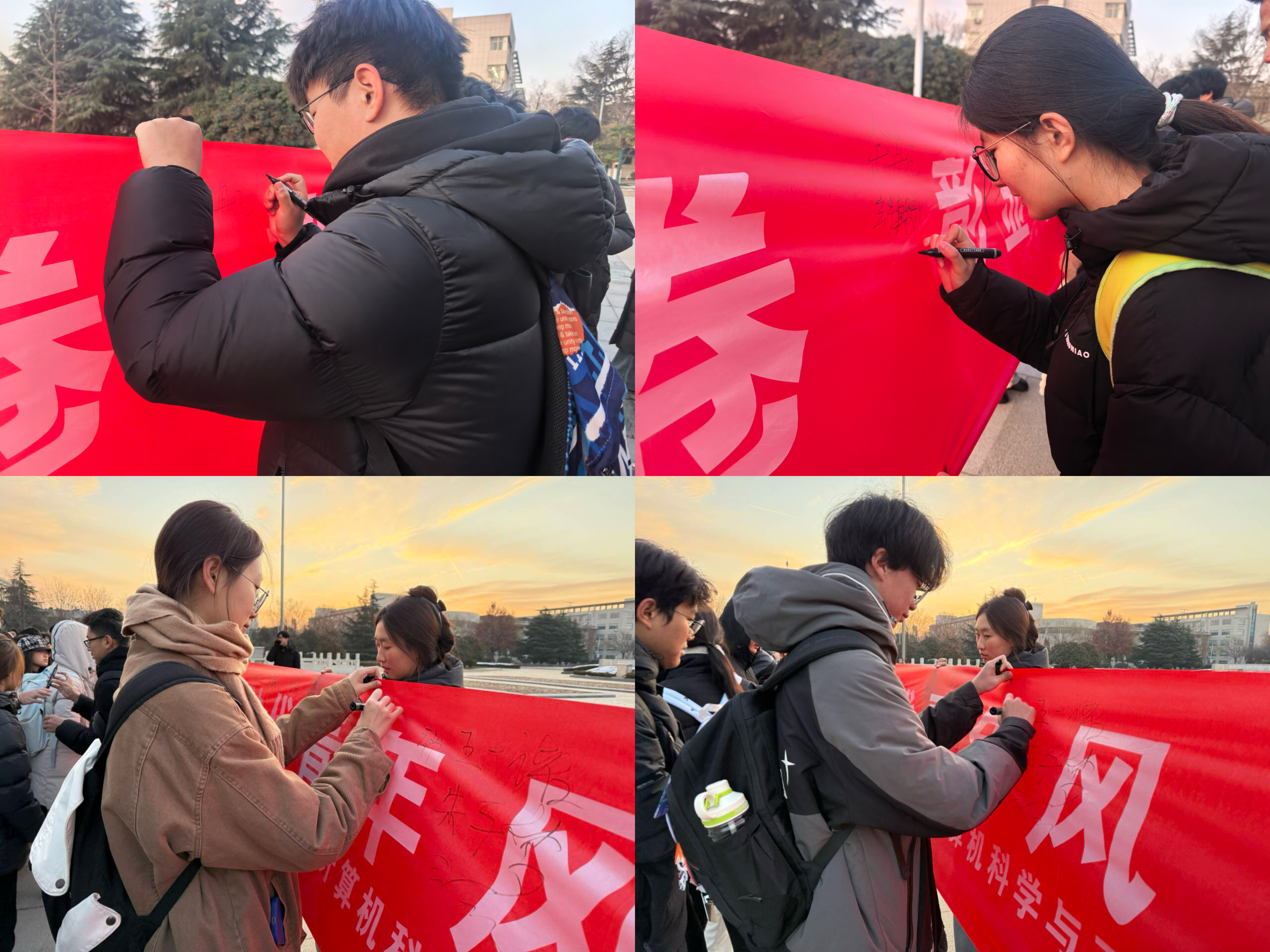 升旗仪式庄严肃穆,师生整齐列队,精神饱满。在激昂的国歌声中,护旗手迈着铿锵步伐护送五星红旗冉冉升起。全体人员肃立注目,齐唱国歌,表达对祖国的崇高敬意。随后,新生代表刘文浩作国旗下发言,结合计算机学科发展趋势,围绕“技术赋能强国”主题,号召同学们坚定科技报国志向,夯实专业能力。2023级学生代表刘超寄语新生,鼓励大家将爱国之情转化为刻苦学习、勇于创新的实际行动。仪式在全体师生的庄严宣誓和签名承诺中圆满结束。
