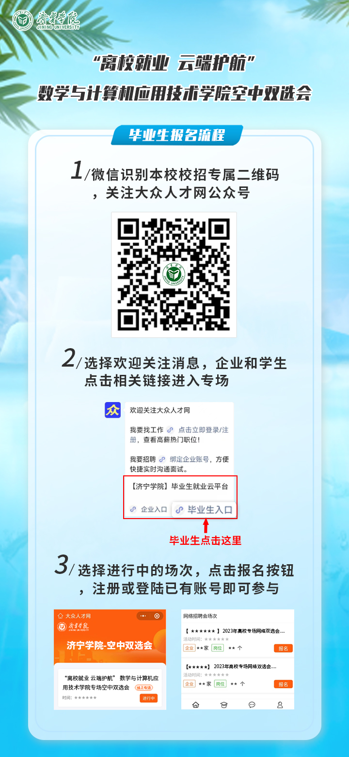 本次双选会采用“大众人才网”网上报名方式,之前未在大众人才网平台注册过的企业和个人需先进行注册完善信息后再报名参与,注册网址www.dazhonghr.com