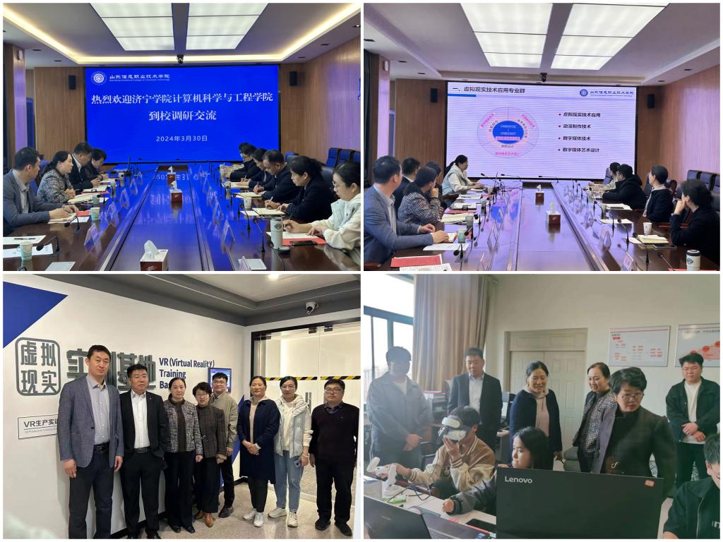 在山东信息职业技术学院,学校党委副书记李国栋、软件与大数据系主任武洪萍、数字媒体系副主任袁永美分别介绍了学校总体情况和虚拟现实技术、软件技术、人工智能技术等专业建设情况和取得的成绩,并表达了在虚拟现实专业建设与元宇宙产业化实践方面与伟德国际1946bv加强交流合作的愿望。张颖、杜永生分别介绍了学院人才队伍建设、学科建设、专业建设等方面的情况,双方就虚拟现实技术专业建设、XR实验室建设方案、元宇宙产业校企协同创新举措、大学生创新创业实践等方面展开了深入交流,