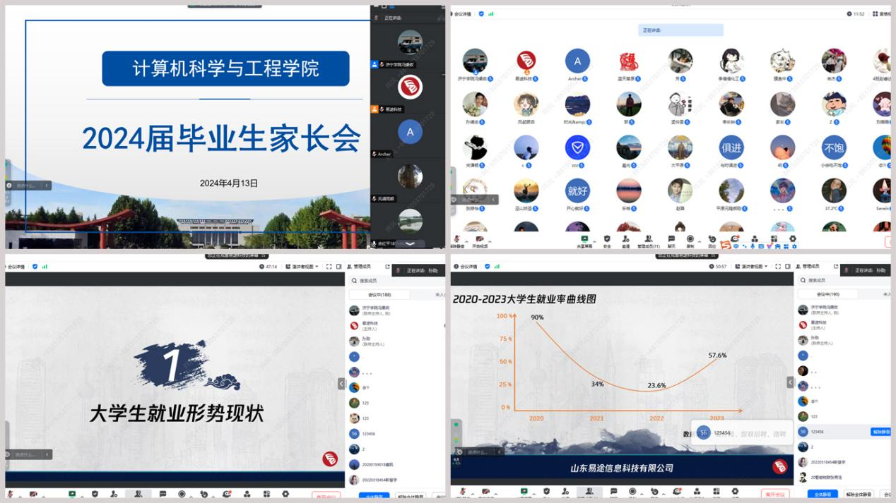 会上,冯秉政从学院2024届毕业生的考研与就业情况,学院已经采取的就业举措和下一步工作计划,应征入伍、三支一扶、基层西部计划等就业项目及相关政策等方面与学生家长进行了交流,强调了学生实习就业期间需要注意的心理问题、安全问题。他希望学生家长能够科学评估孩子的能力素养,树立先就业、再择业的观念,与学院通力合作,共同为孩子高质量就业保驾护航。最后,邀请济南易途科技有限公司孙勋老师对2024年国内计算机相关专业就业形势与特点进行介绍,为毕业生如何更好的发挥专业特长,找到满意的工作进行指导。