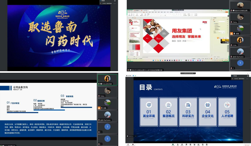 会议伊始,张颖介绍了我院的人才培养质量及2024届毕业生的基本情况。随后,各用人单位进行线上宣讲,各企业就企业概况、企业文化、岗位需求、发展前景及薪资待遇等进行了详细介绍,以便毕业生更好了解企业情况,选择适合自己的岗位。最后,毕业生与各企业代表就选才标准、未来发展、薪资待遇等方面进行了深入交流,有二十余名毕业生向心仪企业递交了简历。