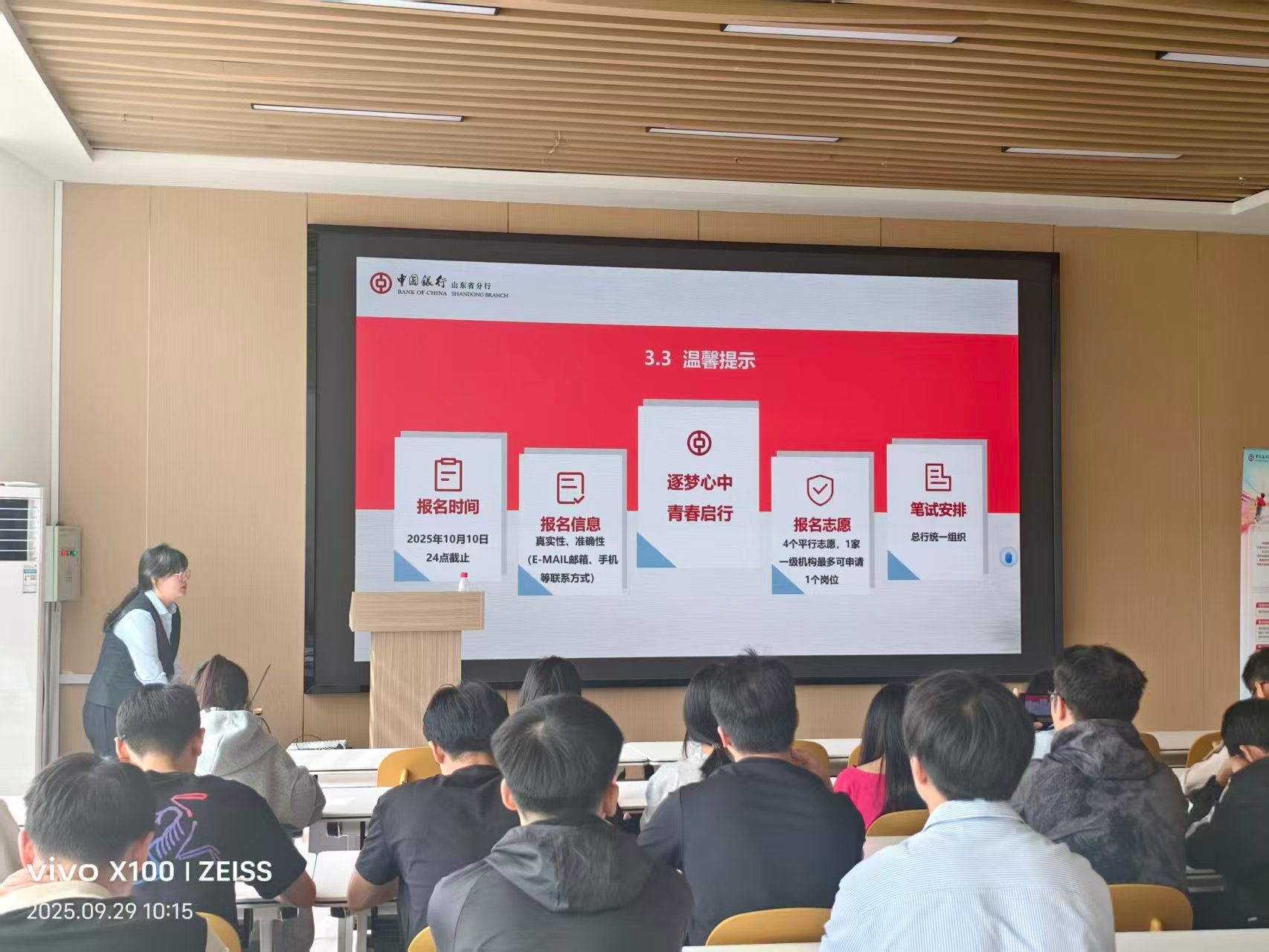 此次宣讲会时机关键,正值山东省各大银行招聘考试报名的紧要关口。两家银行相关负责人分别就各自银行的发展历程、企业文化与就业前景进行了简要介绍,并重点解读了大家最为关心的福利待遇、薪资结构及当前急需的专业人才方向。他们一致称赞我校毕业生专业技术扎实、工作态度踏实,并向同学们发出了诚挚的加盟邀请。