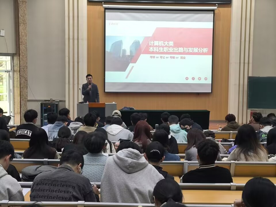 20日上午,李鹏为软件工程、虚拟现实、应用统计学、数据分析等六个专业的五百余名同学授课。21日上午,由袁文建为来自网络安全、网络优化、智能物联、云计算等六个专业的五百余名同学授课。二位讲师从大学生的未来职业选择、考公考研就业出路、就业前景和岗位需求等方面切入,分析我院不同专业学子的职业出路和发展道路,阐述行业发展趋势及人才需求,分析本科生面临的竞争压力和发展机遇,帮助大三学子全面、清晰地认知就业形势,综合考量自身学习能力和发展空间,确立合理的职业定位和职业目标,提前部署、打牢基础,牢牢把握每一次就业机遇,重视自己的每一次选择,努力成为行业的可用之才和优秀人才。二位讲师在讲解中分享多个真实的就业案例,鼓励同学们加强自身能力提升,为自己确立更好的职业生涯和发展路线。幽默风趣的讲解、犀利独到的见解,引得现场掌声阵阵。同学们精神饱满,与老师积极互动,取得了良好效果。