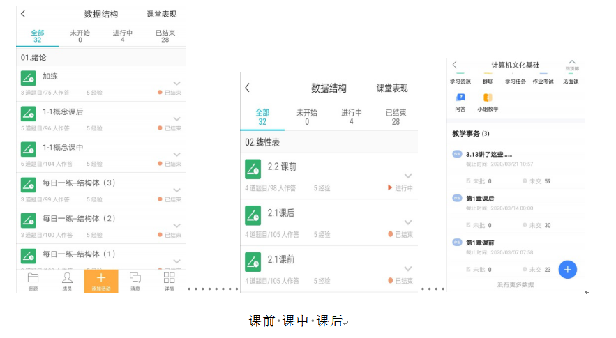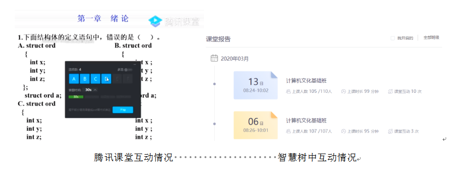 这学期我上的课程有数据结构和计算机文化基础,数据结构课程是一门理论和实践相融合的课程,需要频繁的思维推导以及程序演示;计算机文件基础课程以围绕讲解计算思维展开,比较容易理解,需要板书的知识点不多。为了减少学生再安装、学习新的APP使用方法的烦恼,调查了学生目前手机已安装APP情况,发现学生之前已使用过智慧树的知到APP、云班课APP以及部分教师使用的腾讯课堂APP后,结合课程特点,决定数据结构课程采用腾讯课堂和云班课相结合的方式进行,计算机文化计算采用智慧树翻转课堂和QQ群相结合的方式进行网上直播。实践表明这两种直播方式能够流畅、顺利的完成直播任务,至今没有发生翻车情况。