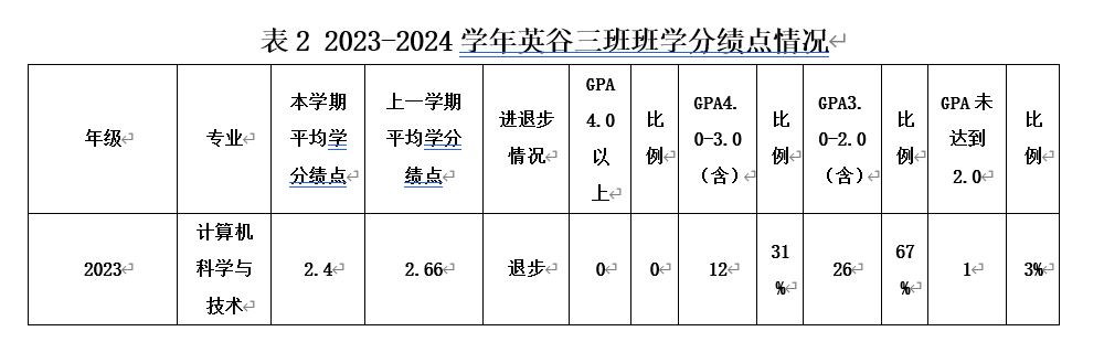 本班参加考试共39人,2023-2024学年班级平均绩点(简称GPA)为2.4,其中班级GPA4.0-3.0(含)学生12人,占比31%;GPA3.0-2.0(含)学生26人,占比67%;无GPA4.0及以上学生且存在未达到2.0学生1人。