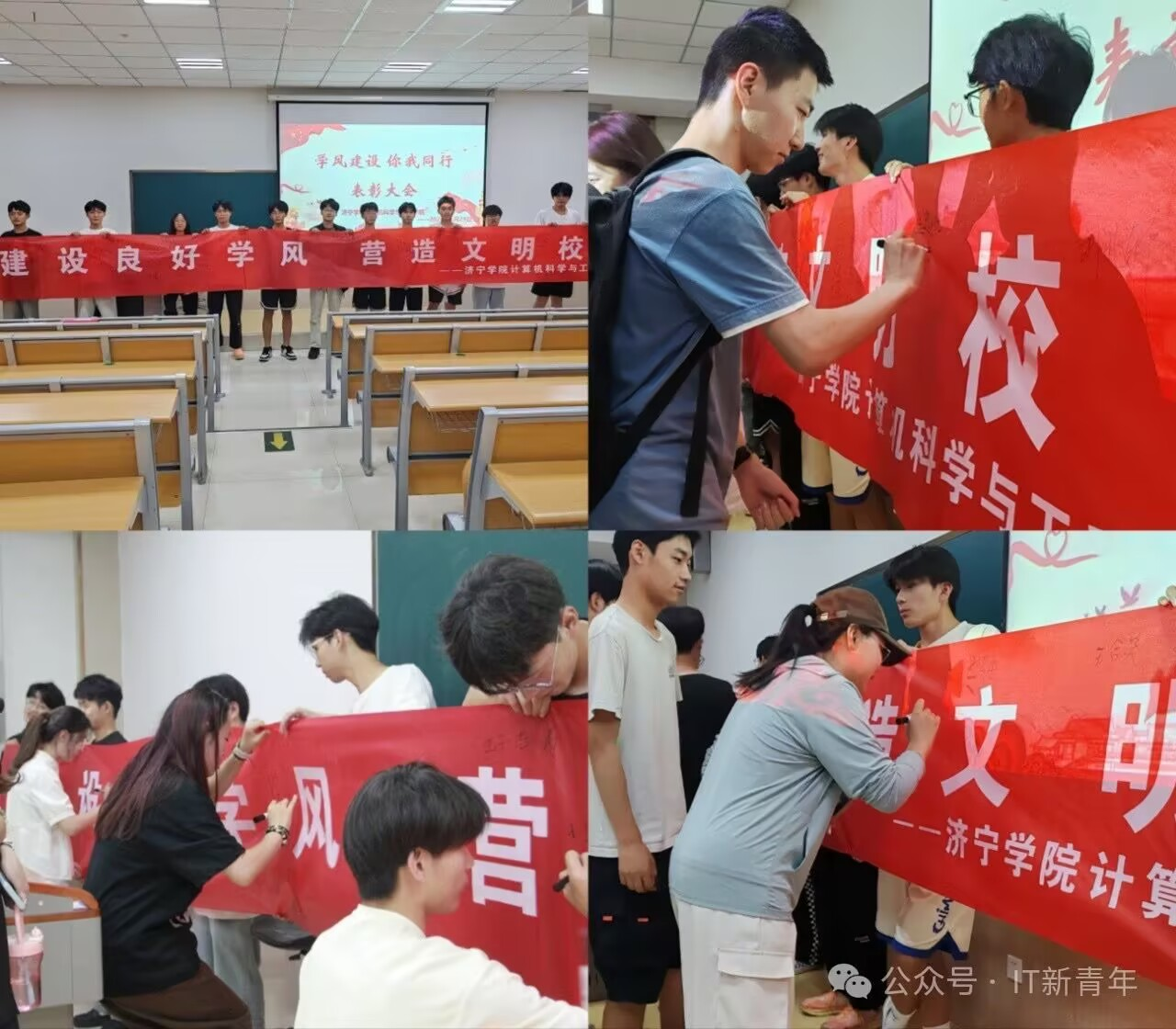 大会伊始,优秀学生杨文睿、刘静雯作为代表上台分享学习经验。他们结合自身经历,深入阐释了学风对班级的重要影响,并提出了对学风建设的期望和建议。代表们的发言引发了同学们的强烈共鸣,纷纷表示要以优秀学生代表为榜样,努力学习,不断提升自己。随后,武群宣布了主题演讲比赛、海报标语设计比赛、优良学风班级获奖名单。学院老师为获奖的班级和个人颁发了荣誉证书,并拍照留念。这些荣誉不仅是对获奖者的肯定,更是对全体同学的激励。表彰环节结束后,范建田对本次大会进行了总结和指导。她强调了学风建设的重要性,并呼吁全体学生共同努力,为营造良好的学风贡献自己的力量。范建田的讲话为同学们指明了方向,鼓舞了士气。最后,每一位参与大会的同学都在横幅上郑重地签下了自己的名字,表达了他们积极参与学风建设的决心。至此,“学风建设,你我同行”表彰大会圆满落下帷幕。